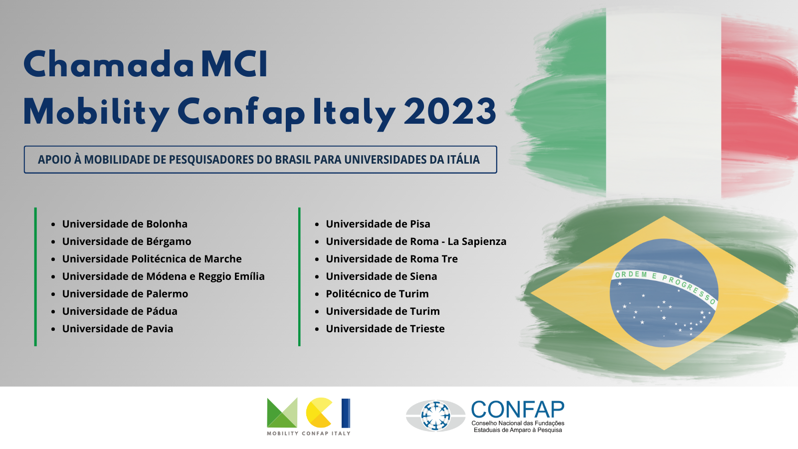 O Conselho Nacional das Fundações Estaduais de Amparo à Pesquisa (CONFAP) lançou na quarta-feira (22/11), a Chamada MCI – Mobility Confap Italy 2023, de apoio à mobilidade de pesquisadores do Brasil para universidades da Itália.
