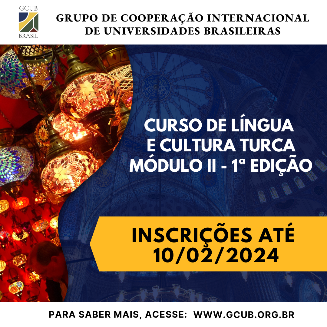 O Grupo de Cooperação Internacional de Universidades Brasileiras (GCUB) abriu as inscrições para o Curso de Língua e Cultura Turca – Módulo II - 1ª Edição, a ser ministrado em português.