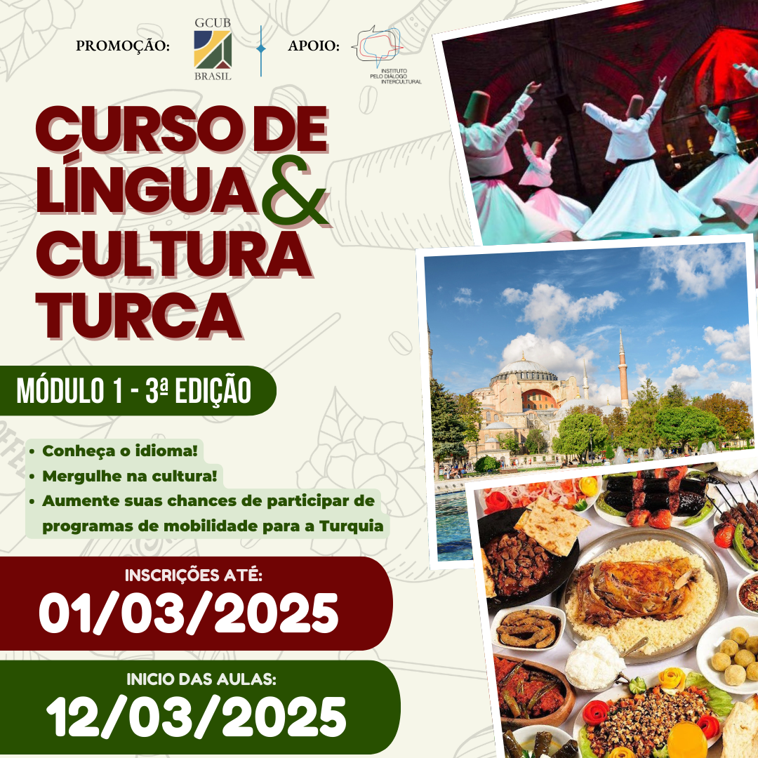 O Grupo de Cooperação Internacional de Universidades Brasileiras (GCUB) abriu as inscrições para o Curso de Língua e Cultura Turca – Módulo I - 3ª Edição, a ser ministrado em português.
