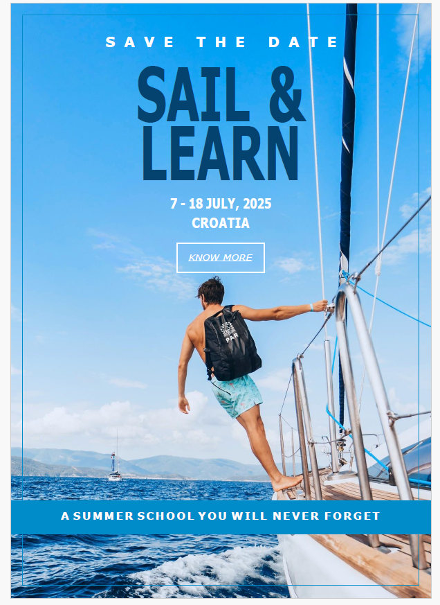 Durante o programa Sail & Learn, os alunos participarão de workshops temáticos na Universidade de Ciências Aplicadas PAR, na cidade de Rijeka. Eles terão a oportunidade de praticar suas habilidades de comunicação e interculturais. A escola de verão também inclui aulas de veleiro no exterior, navegação pela deslumbrante costa croata e desenvolvimento do trabalho em equipe em um ambiente dinâmico e real, além de estudos de caso e visitas de campo conduzidas por especialistas do setor e líderes acadêmicos.